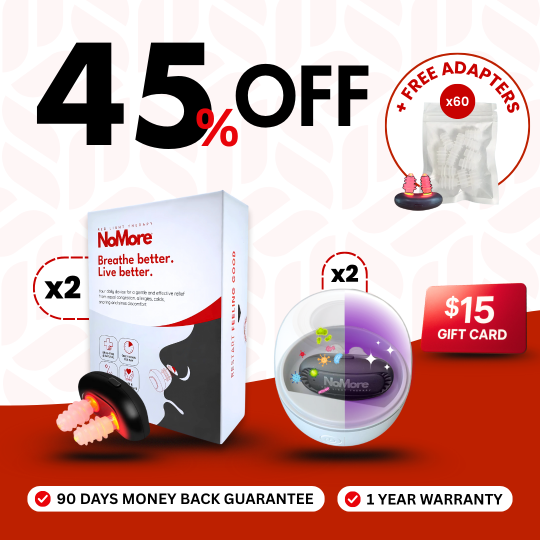 The NoMore® Complete Sinus Relief & Hygiene Kit combines advanced Red Light Therapy with a powerful UV sterilization system, offering a safe, drug-free solution for colds, sinusitis, and chronic congestion.